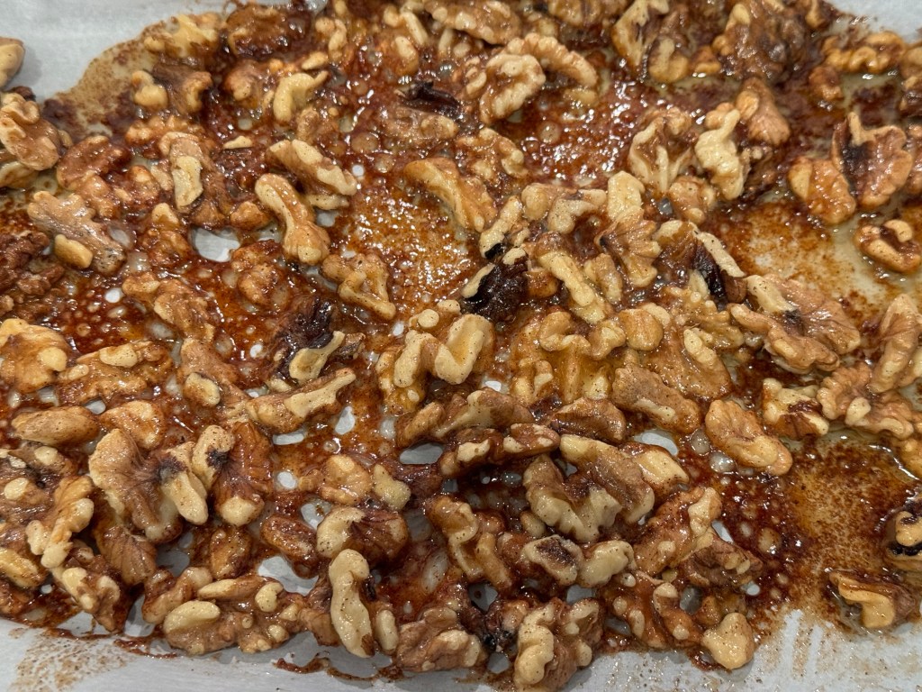 I would recommend marinating the chicken overnight to allow for it to get maximum flavor. This also allows you to start cooking right away. Roast the chicken in the oven for about 25 minutes. While the chicken is cooking, you can prepare your walnuts. Melt the butter, then add the cinnamon and honey. In a bowl, pour the butter mixture over the walnuts, stirring to coat. Roast the walnuts for about 15 minutes.