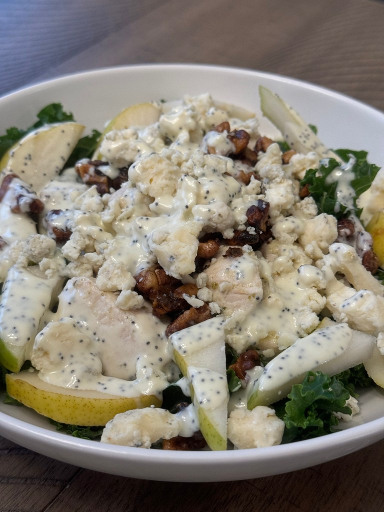 The pears and Gorgonzola cheese in this salad pair perfectly together (pun intended). The sweetness of the pear off sets the saltiness and creaminess of the Gorgonzola in such a way that leaves the salad feeling light, yet also filling. The cinnamon and honey roasted walnuts add a little bit extra crunch while the tender chicken breasts add some protein. The salad is tied together with a poppy seed dressing that is sweet and tangy.