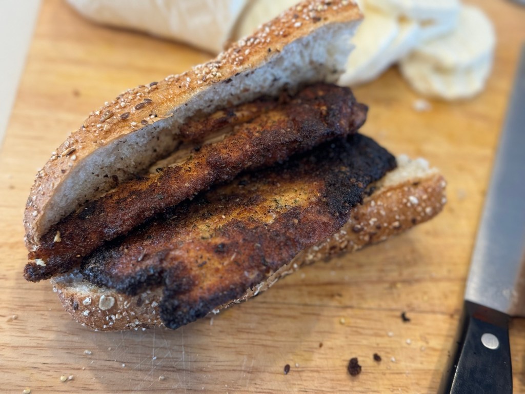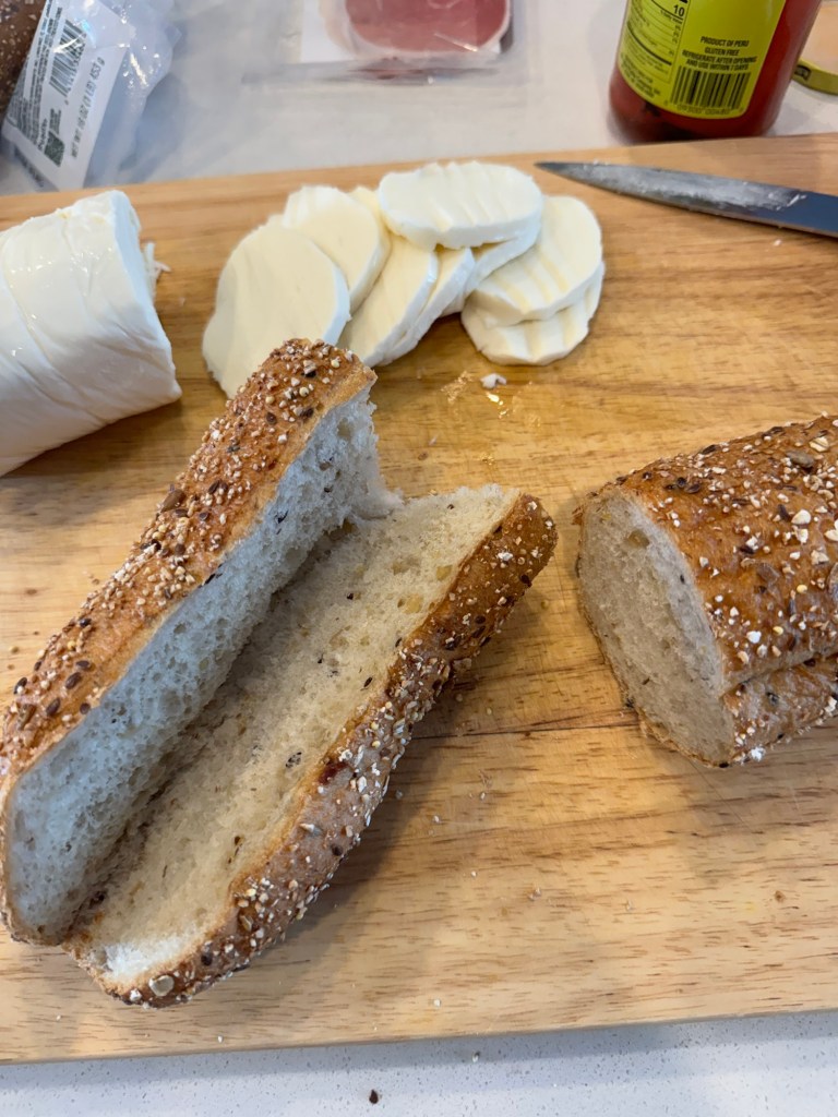 Once you have your chicken cutlets prepared, the rest of the sandwich prep is easy! Prepare your bread by slicing it long ways.