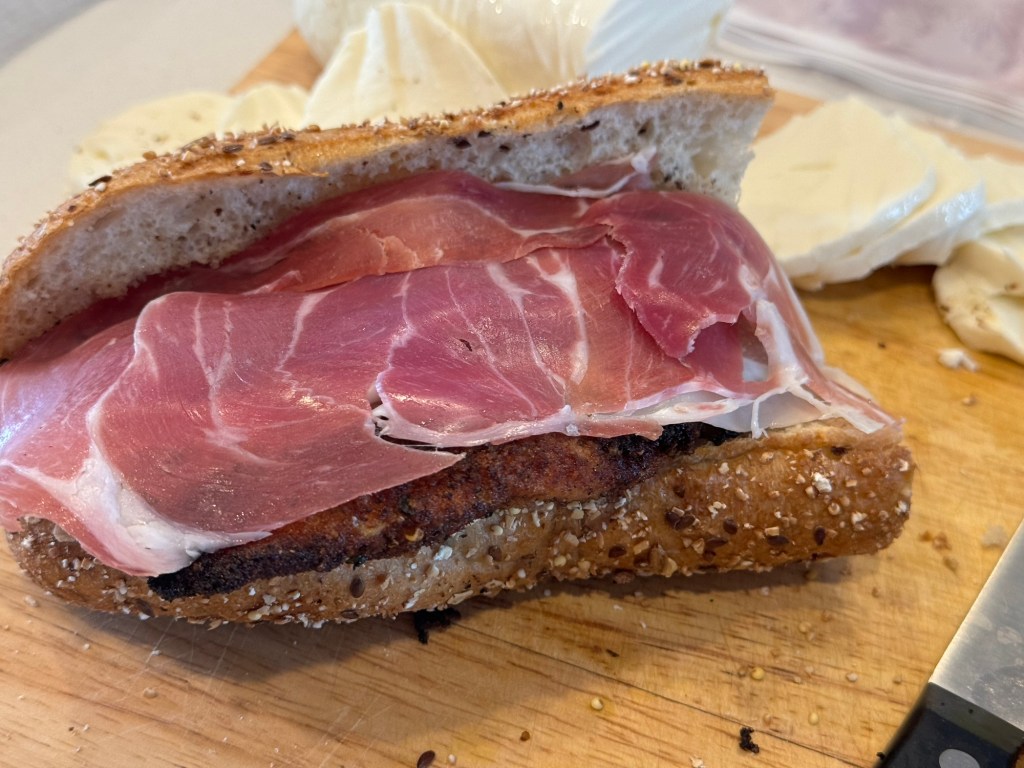 Next layer the prosciutto. I usually add about two slices per sandwich.