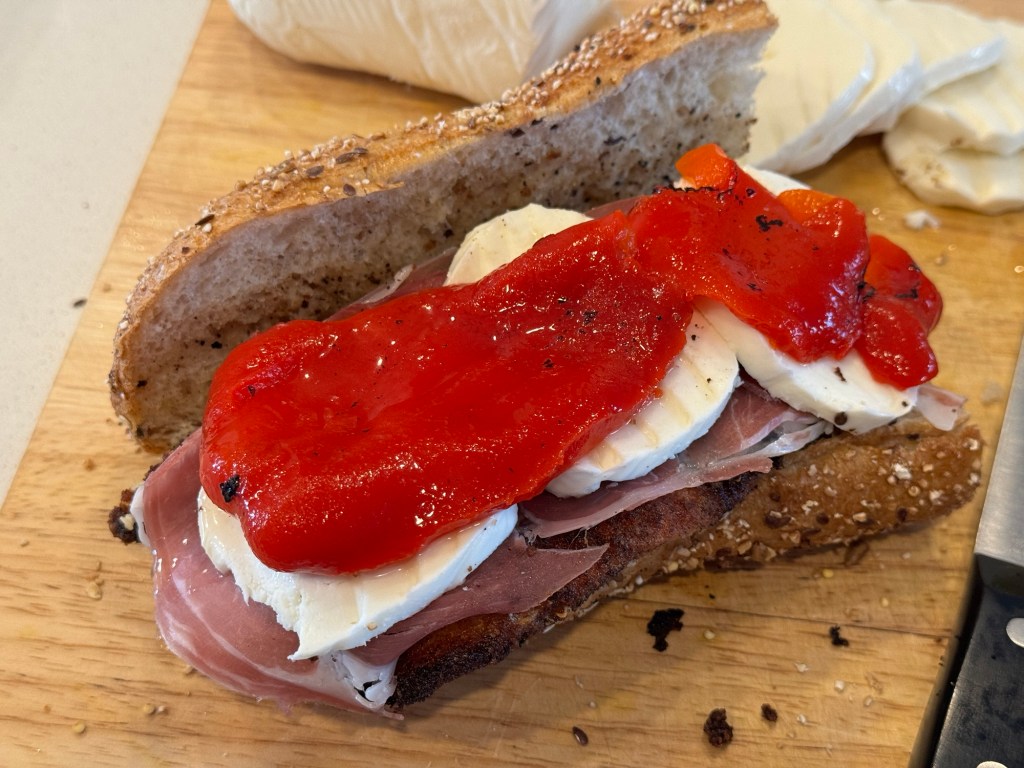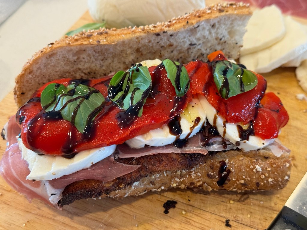 This sandwich combines salty prosciutto with a crispy chicken cutlet. It’s then topped with roasted red peppers, mozzarella cheese, basil, and a drizzle of balsamic glaze and extra virgin olive oil. This sandwich will have you coming back for more every time.