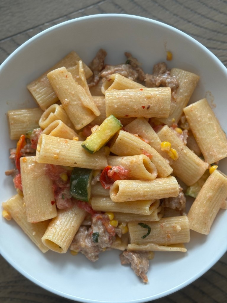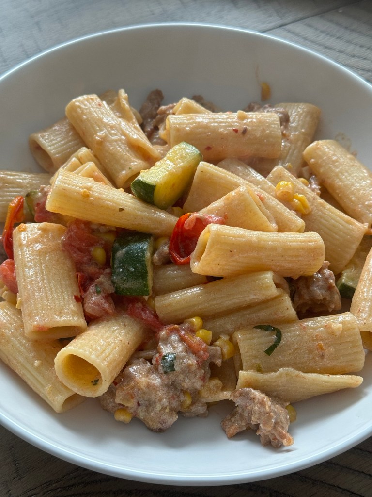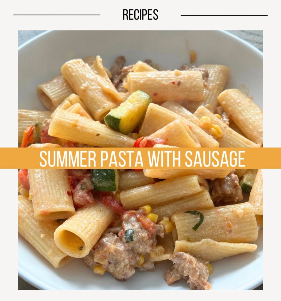 I love pasta. And I also love making pasta for the season. This summer pasta hits all of the notes. Plus it’s very easy to make, only uses 2 pans (1 for the pasta, 1 for everything else), and can be made in less than 30 minutes if you prep the vegetables while you cook the sausage and pasta!