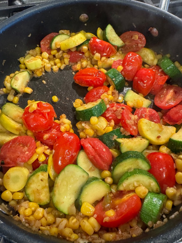- In the same pan, add 1 tbsp olive oil. Once oil is heated, add in the shallot, garlic, and green and yellow squash. Cook for about 7 minutes until squash and shallots have softened. Then stir in the grape tomatoes and corn. Cook for another 5 minutes until tomatoes start to crinkle and soften, stirring intermittently.