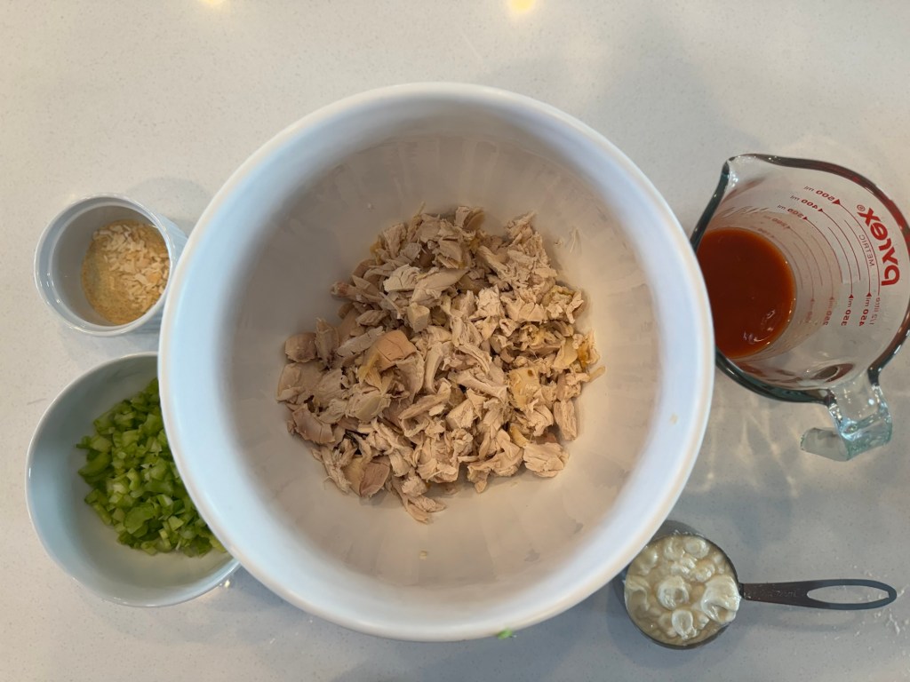 The rest is easy! Simply add the mayo, buffalo wing sauce, minced onion, garlic powder, and diced celery to the bowl with the chicken and stir well to combine!