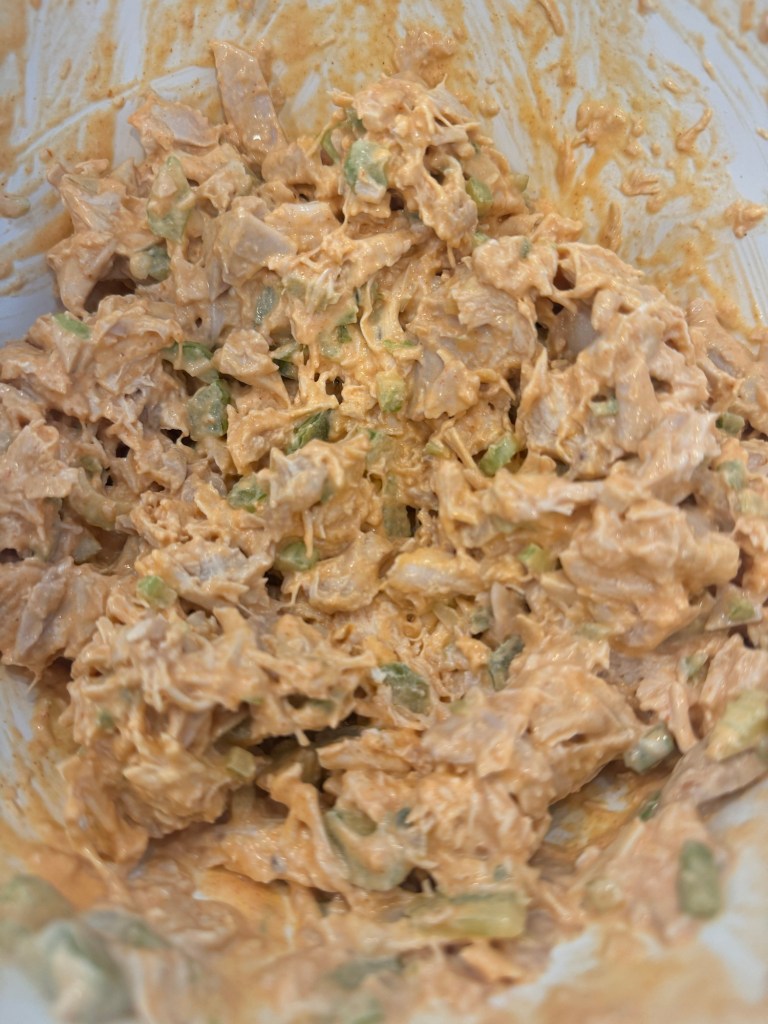 This dish combines the best of both worlds- savory chicken salad with spicy buffalo sauce. It’s perfect on a sandwich or served as a dip!